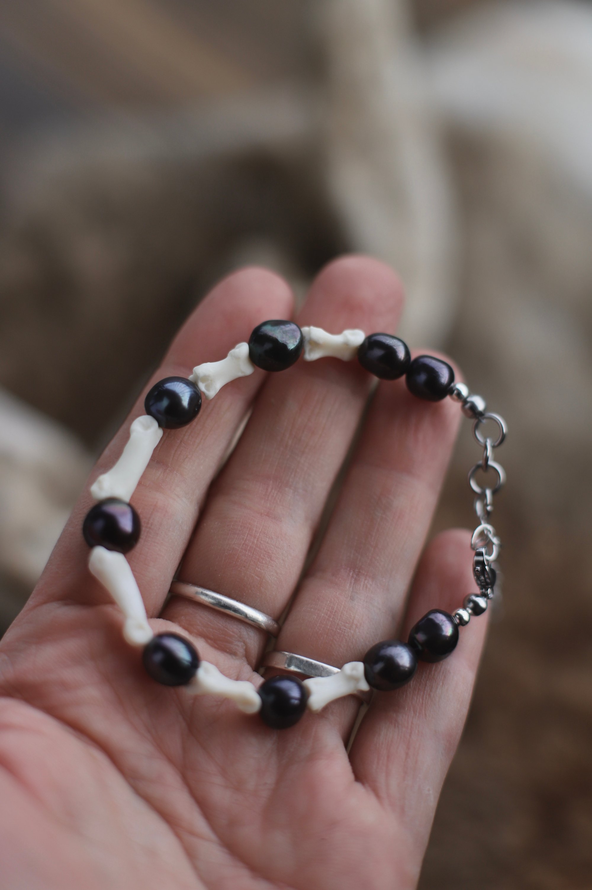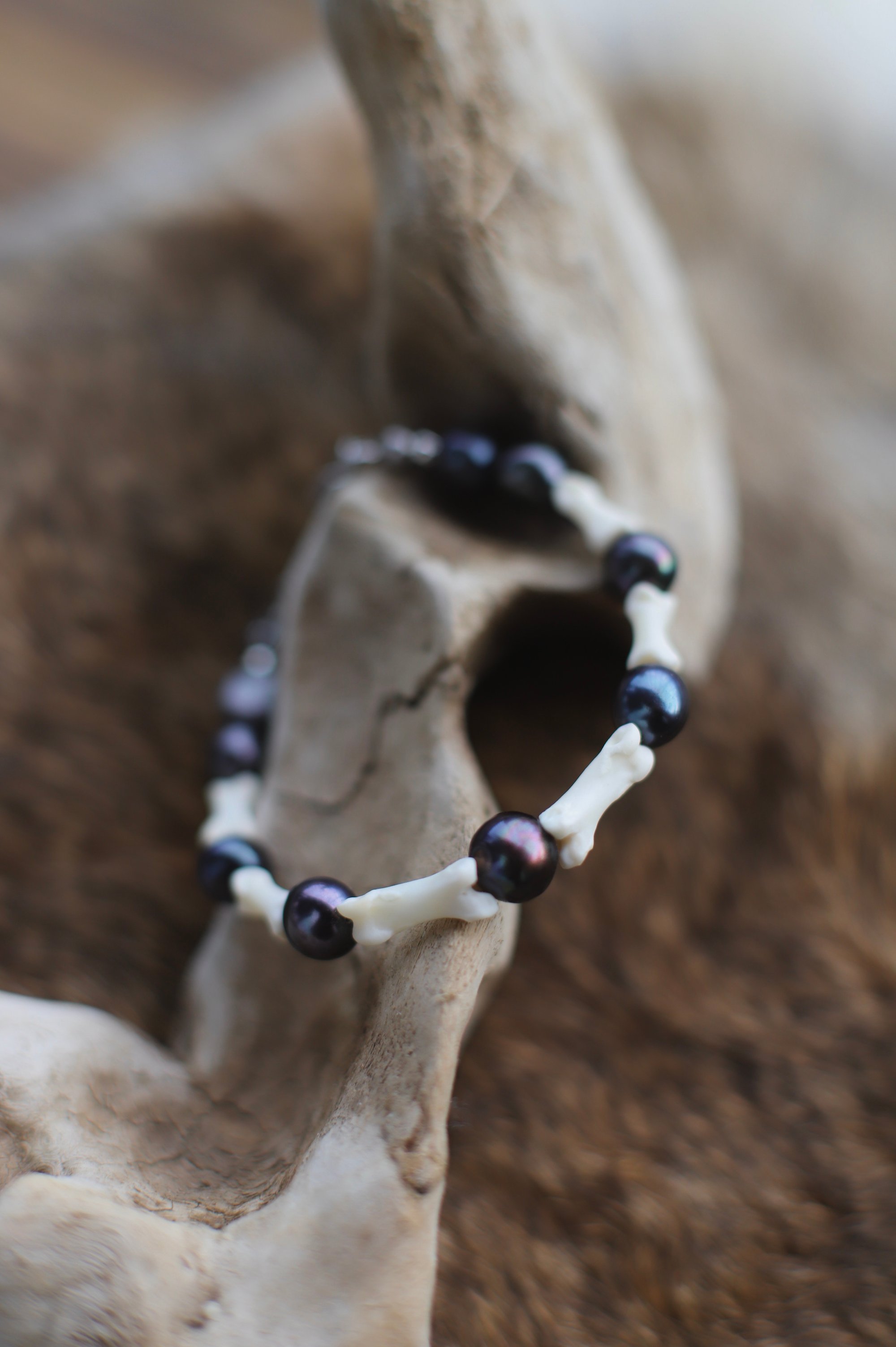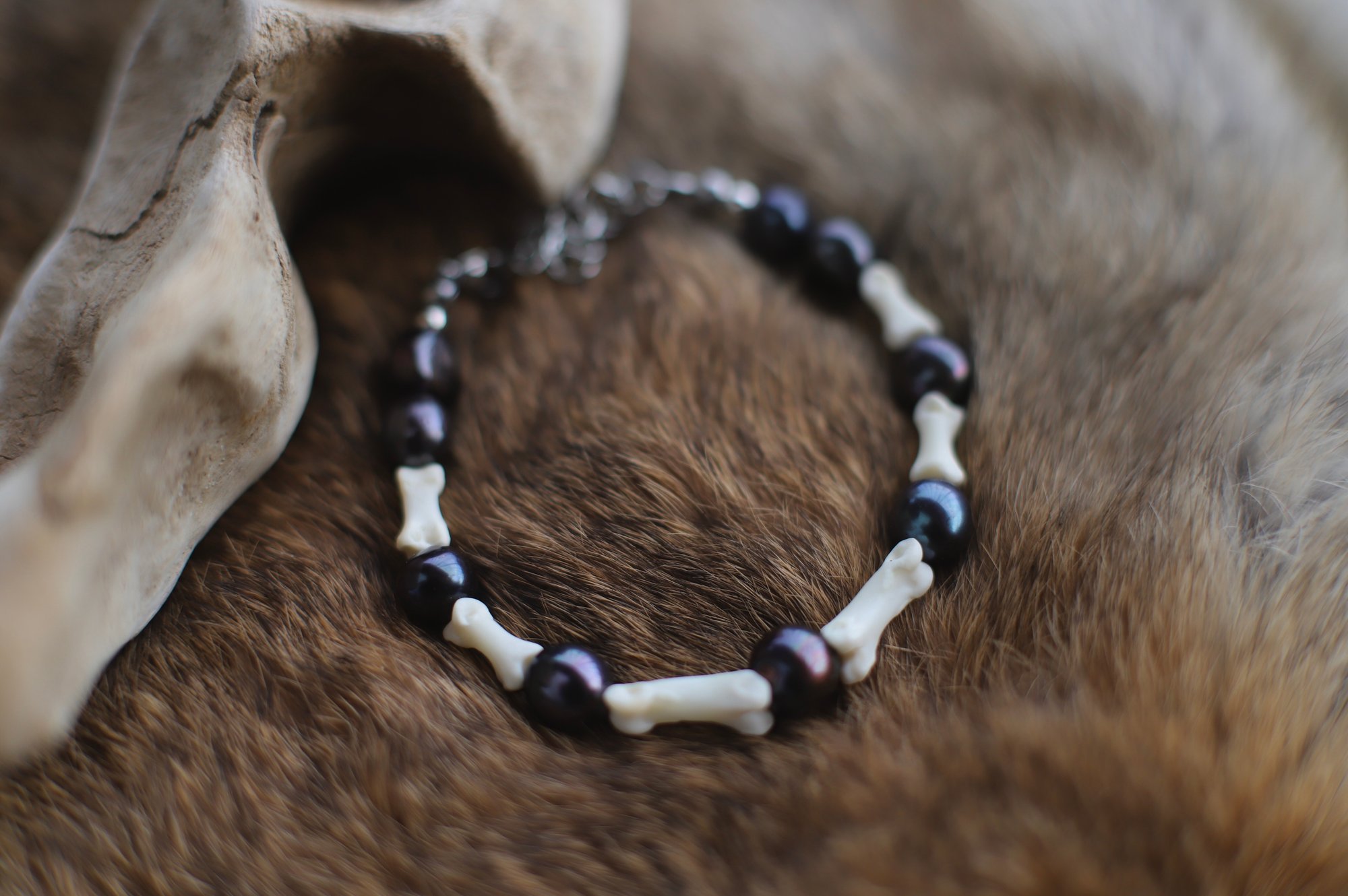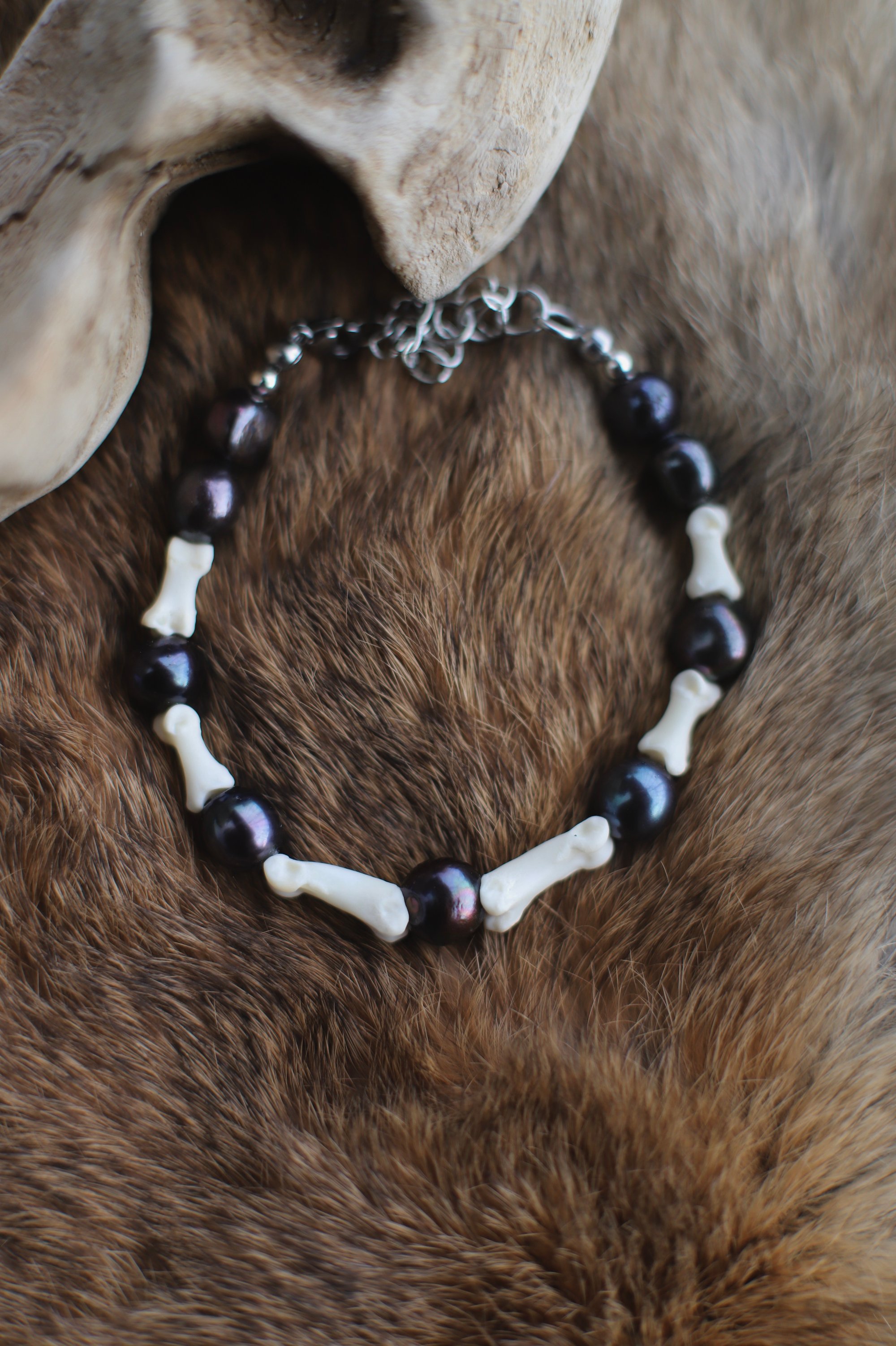 Bracciale realizzato con perle nere e falangi di volpe