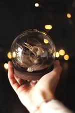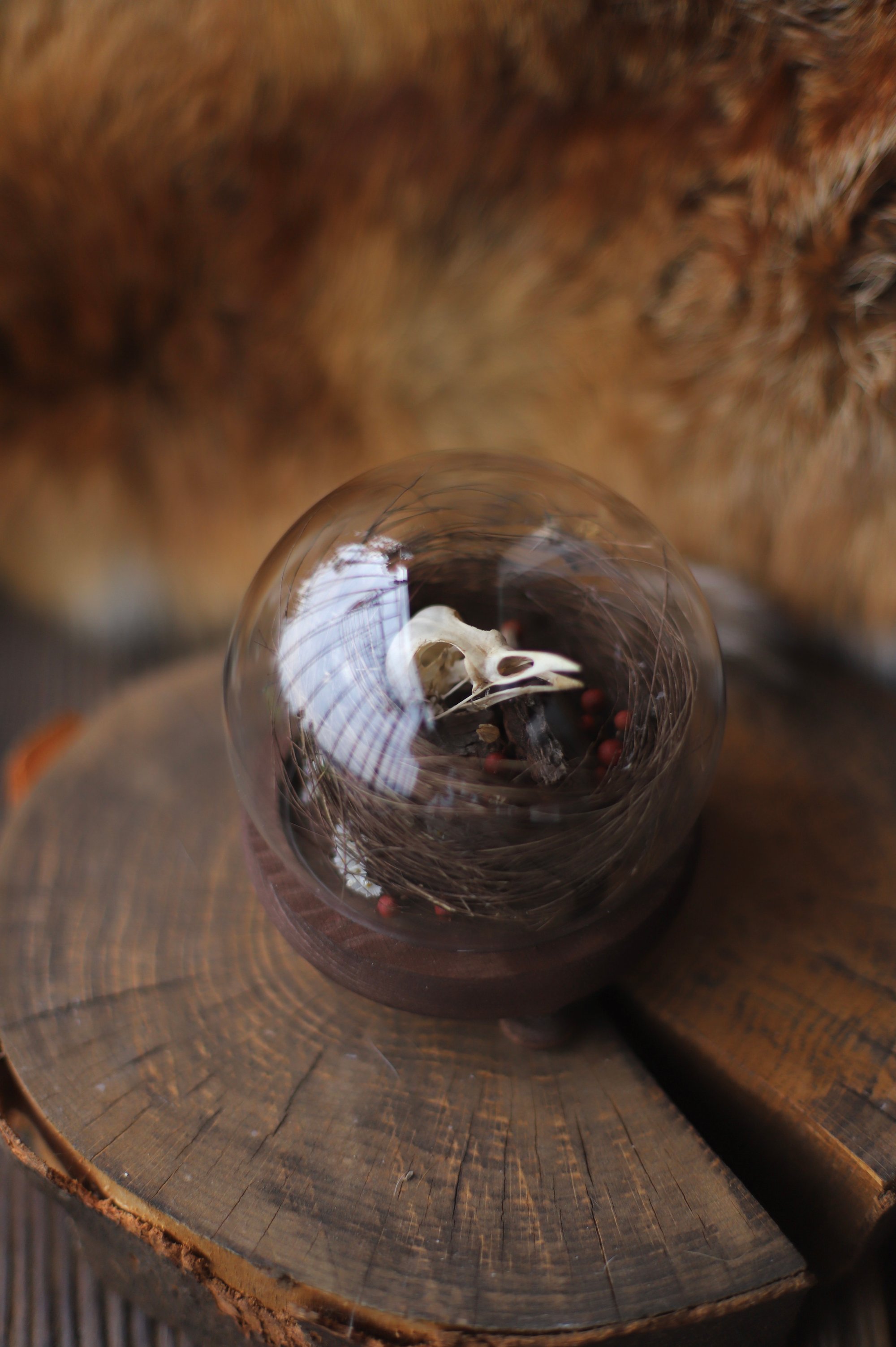 Campana di vetro sferica con all'interno un teschio di merlo dentro ad un nido di uccelli abbandonato in costruzione