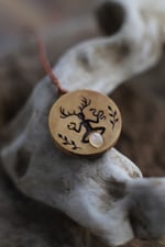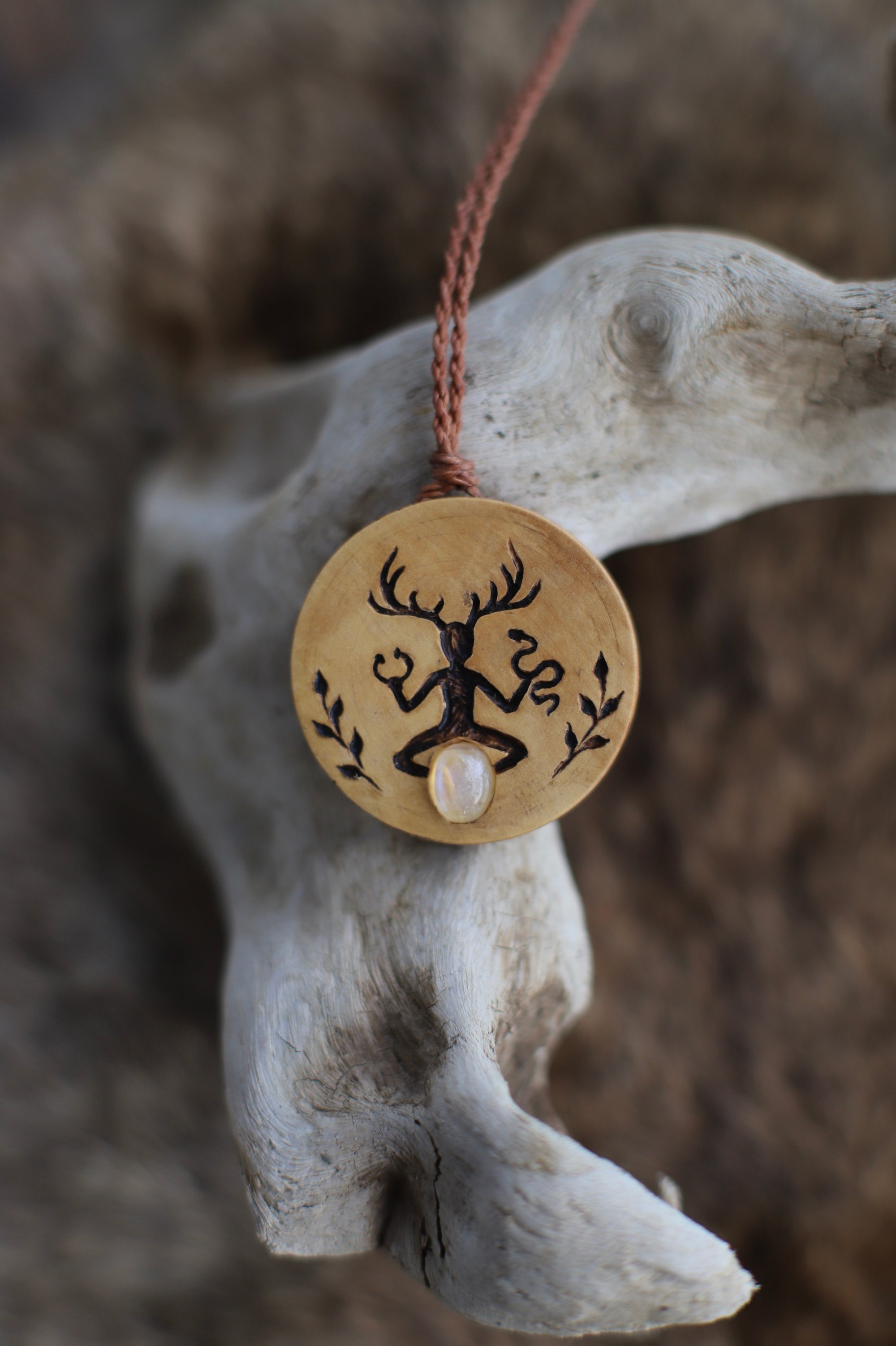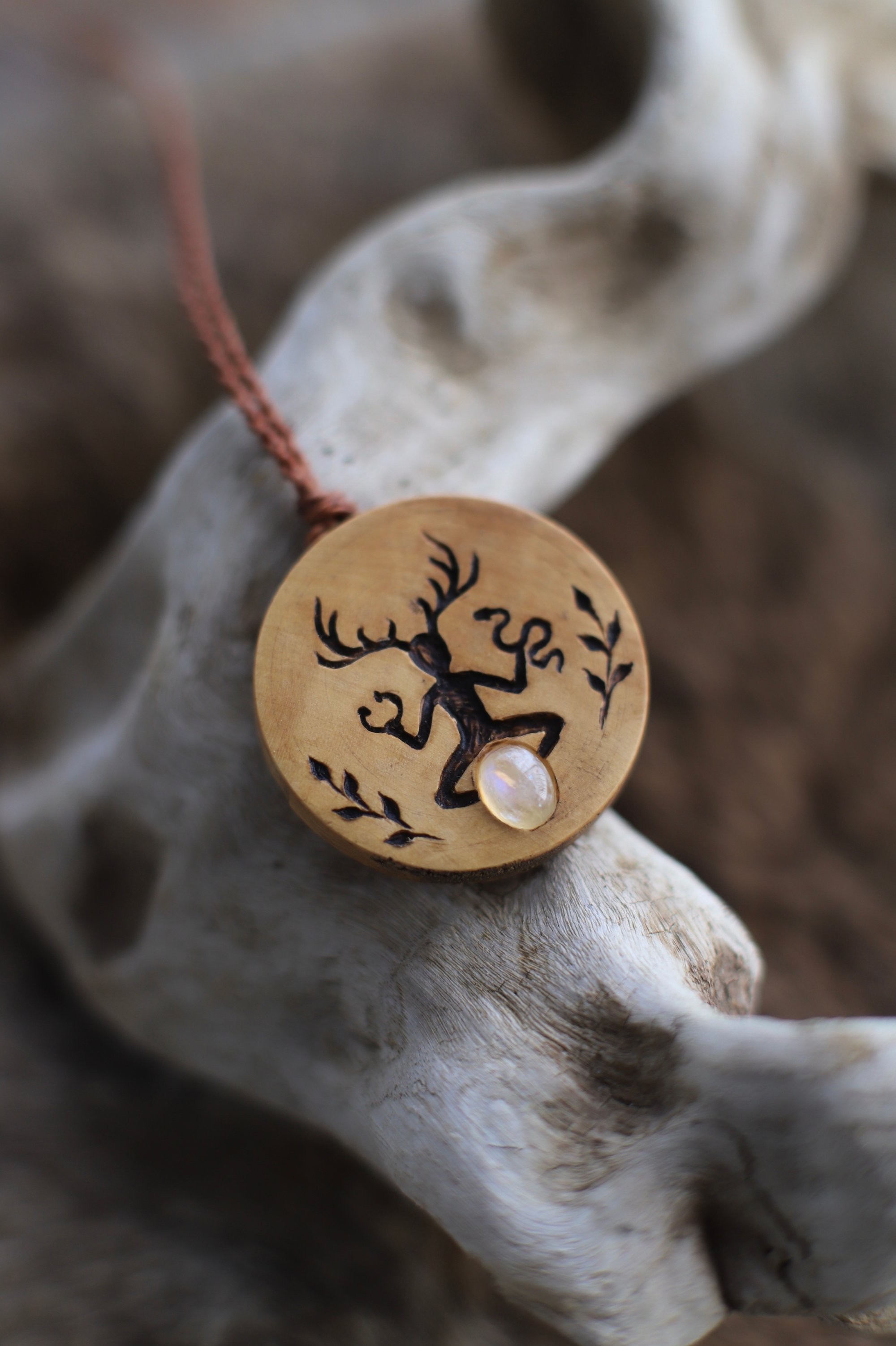 Ciondolo realizzato in legno di bosso con Cernunnos inciso e scurito, decorato con labradorite bianca.