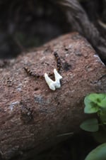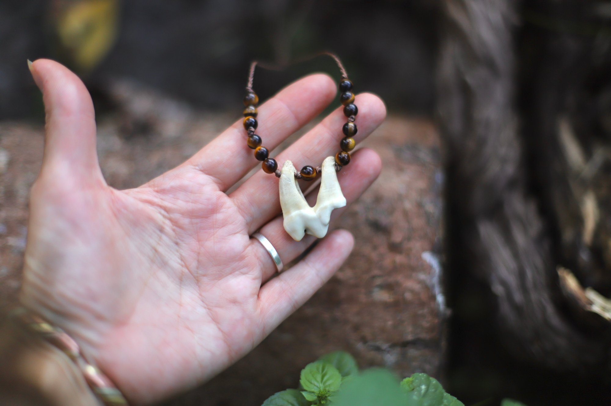 Collana con chiusura regolabile -cordino cerato intrecciato- realizzata a mano con perline di occhio di tigre e dente di canide.