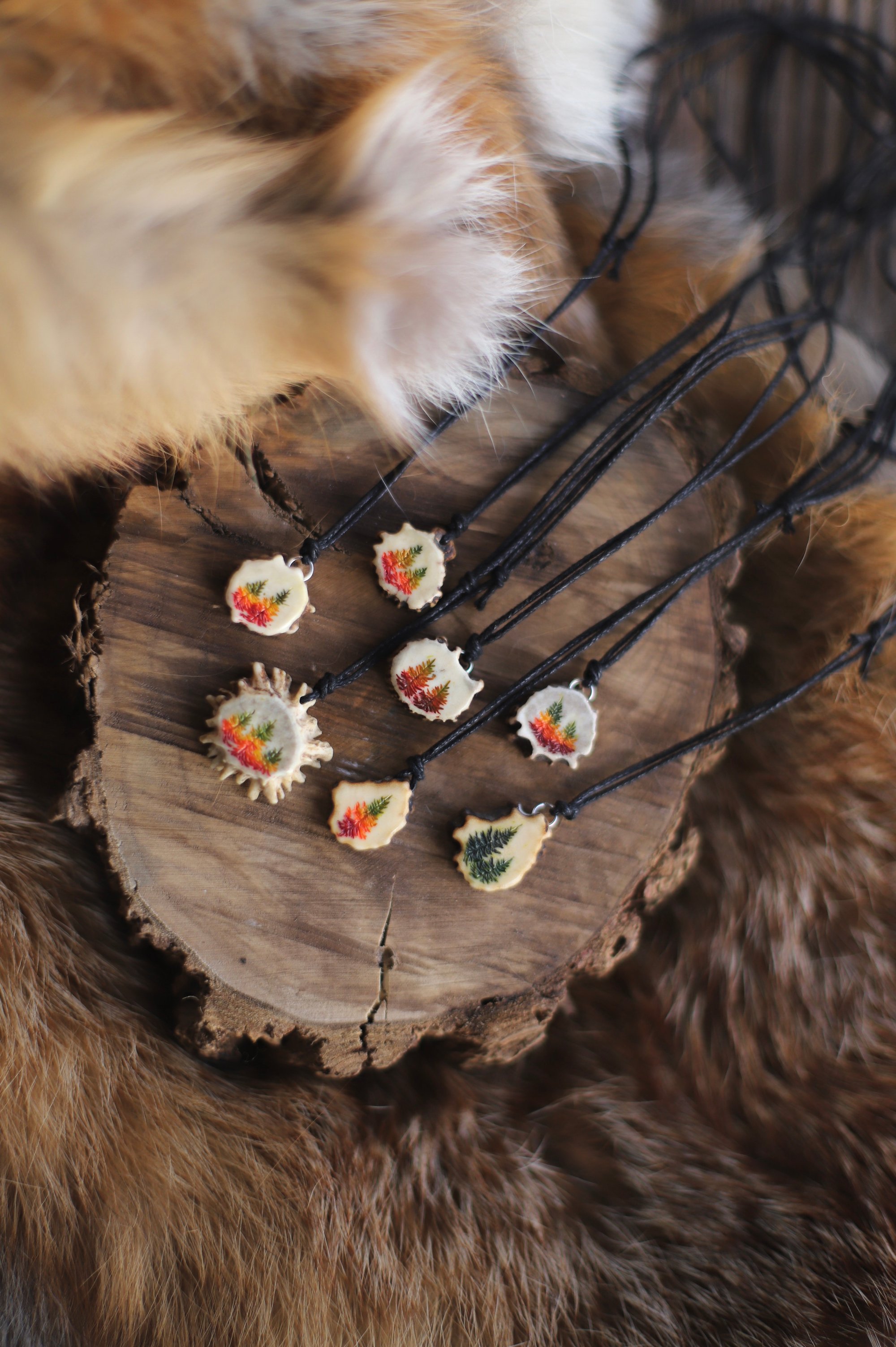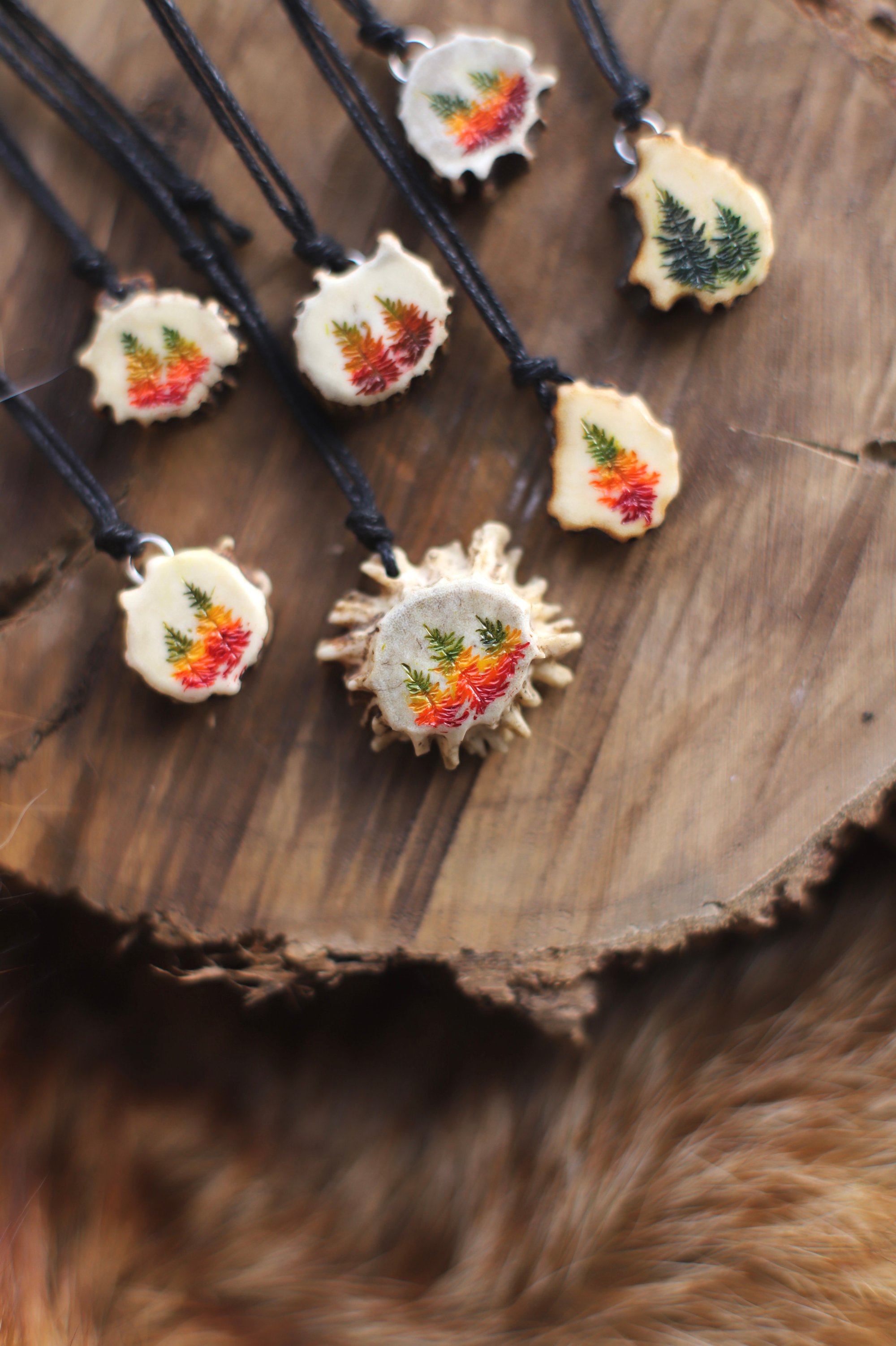 Ciondolo in fetta di corno di capriolo con larici autunnali e verdi incisi a mano e successivamente dipinti con acquarelli (+ vernice protettiva)