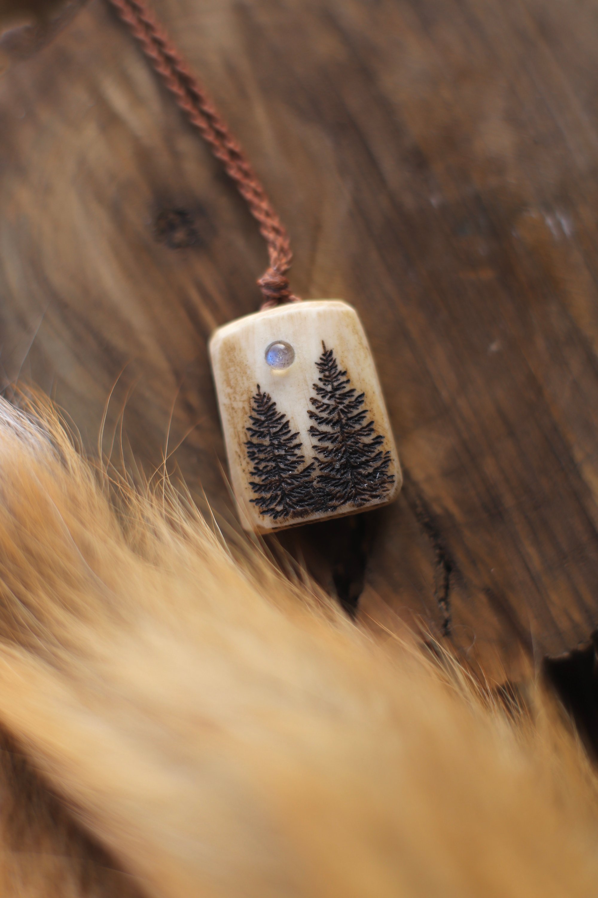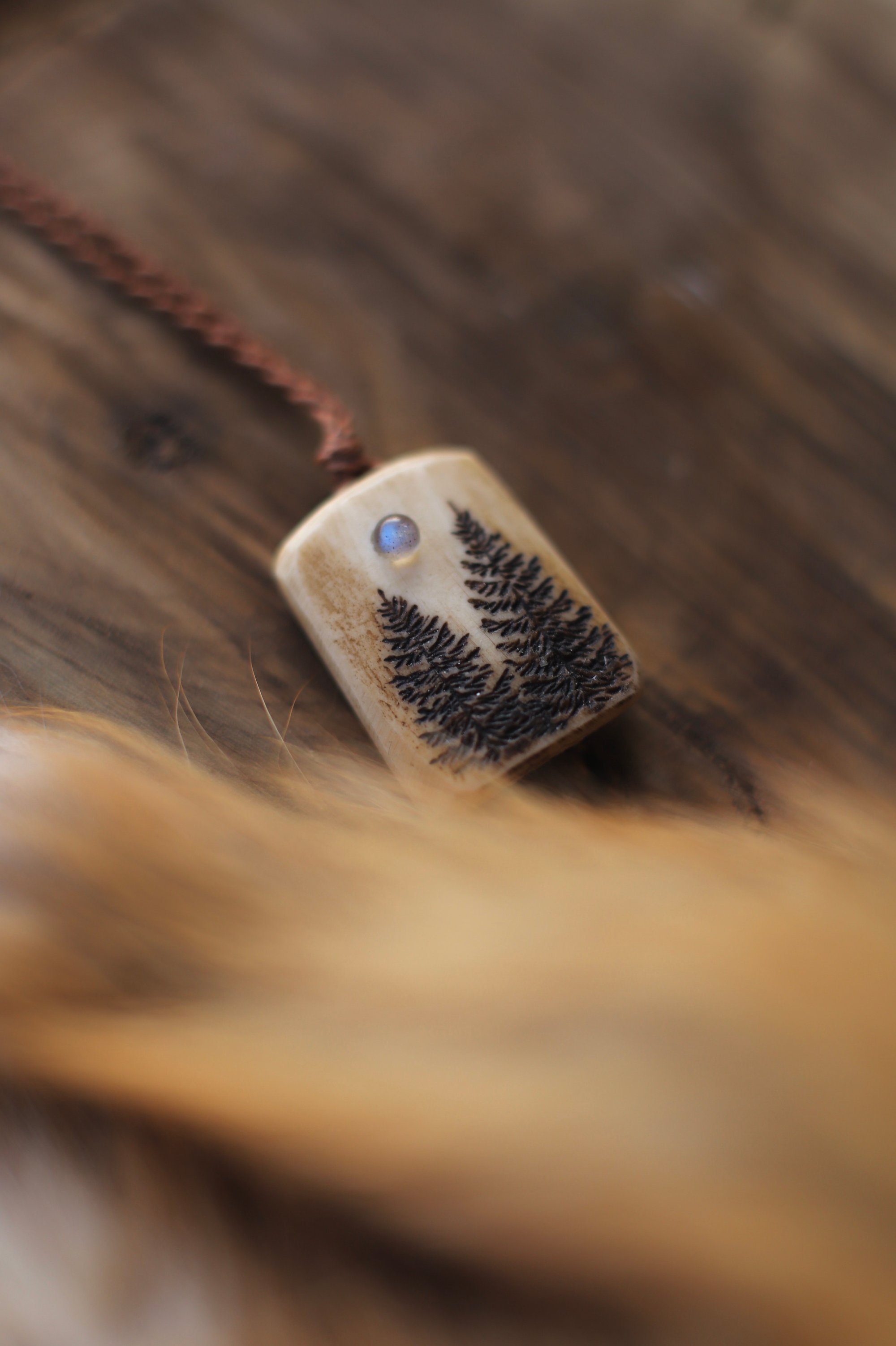 Ciondolo realizzato partendo da parti d'osso, levigate fino a ricavarne delle placche di forma squadrata e poi incise e scurite con cera anticante. Decorato con cabochon di labradorite.