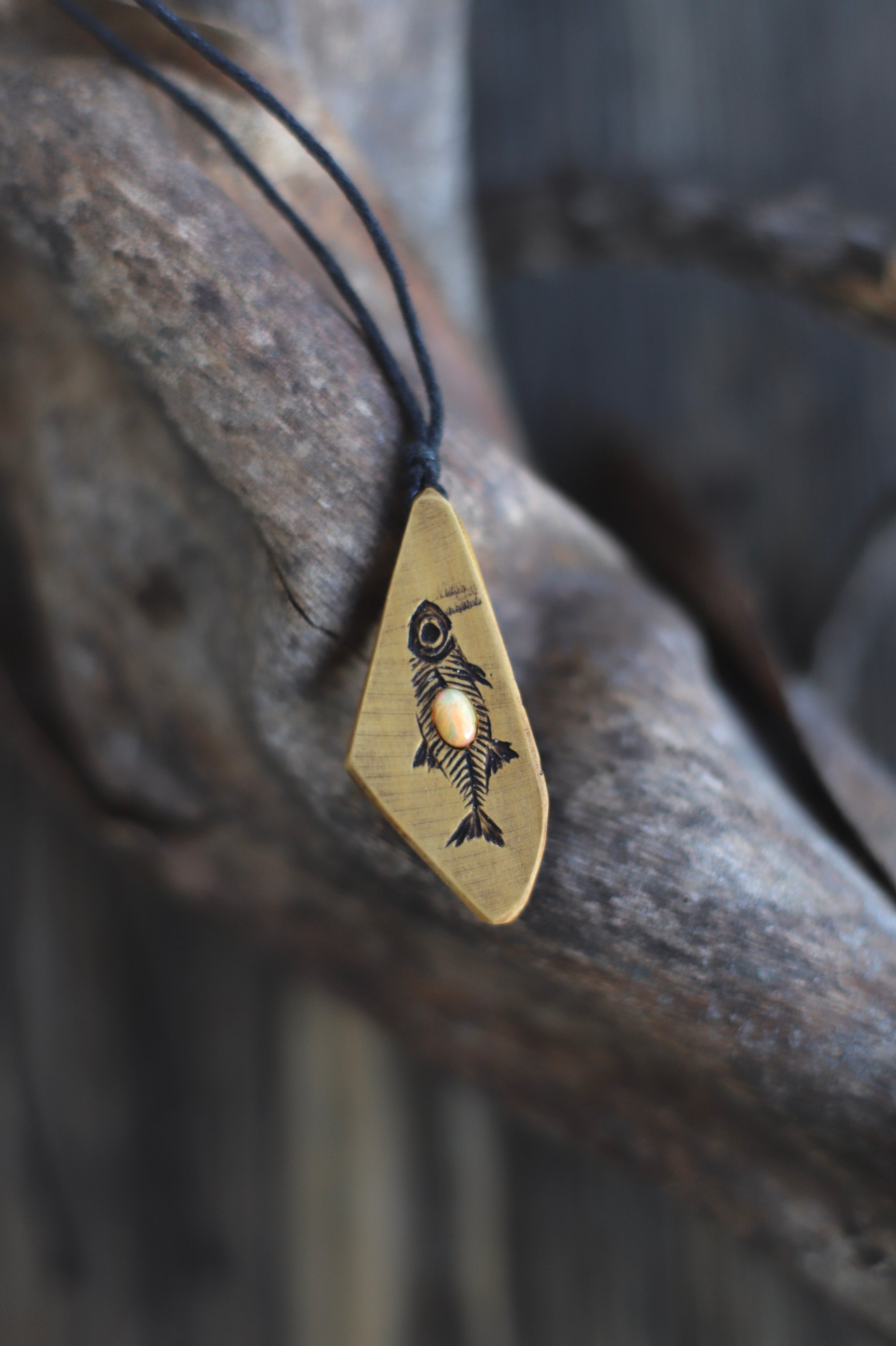 Collana con ciondolo in legno di bosso con riproduzione di pesce fossile (disegno inciso e poi scurito), con opale etiope.