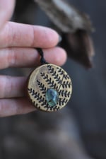 Collana con ciondolo in legno di bosso con riproduzione di felce fossile (disegno inciso e poi scurito), con pietra taglio rosecut di opale peruviano.