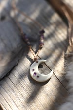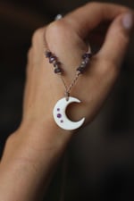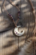 Collana realizzata con luna in osso su cui sono incastonati tre piccoli cabochon tondi di ametista. Il cordino, cerato a doppio filo, è decorato con chips di ametista ed ha chiusura regolabile.