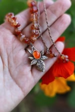 Collana realizzata con ciondolo in corno di cervo inciso (cinque foglioline con al centro un cabochon di corniola), chips di corniola, componenti in acciaio inossidabile e cordino intrecciato a due fili con chiusura regolabile.