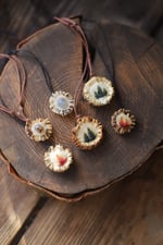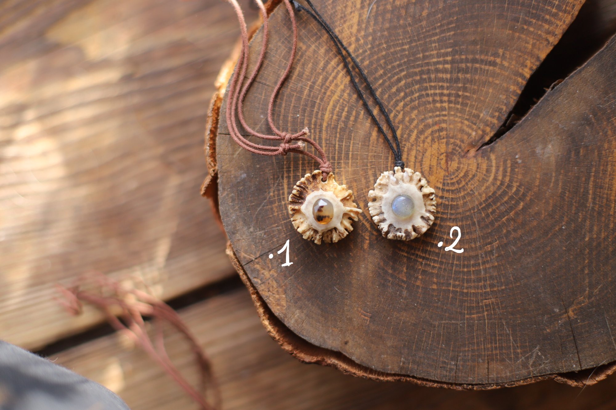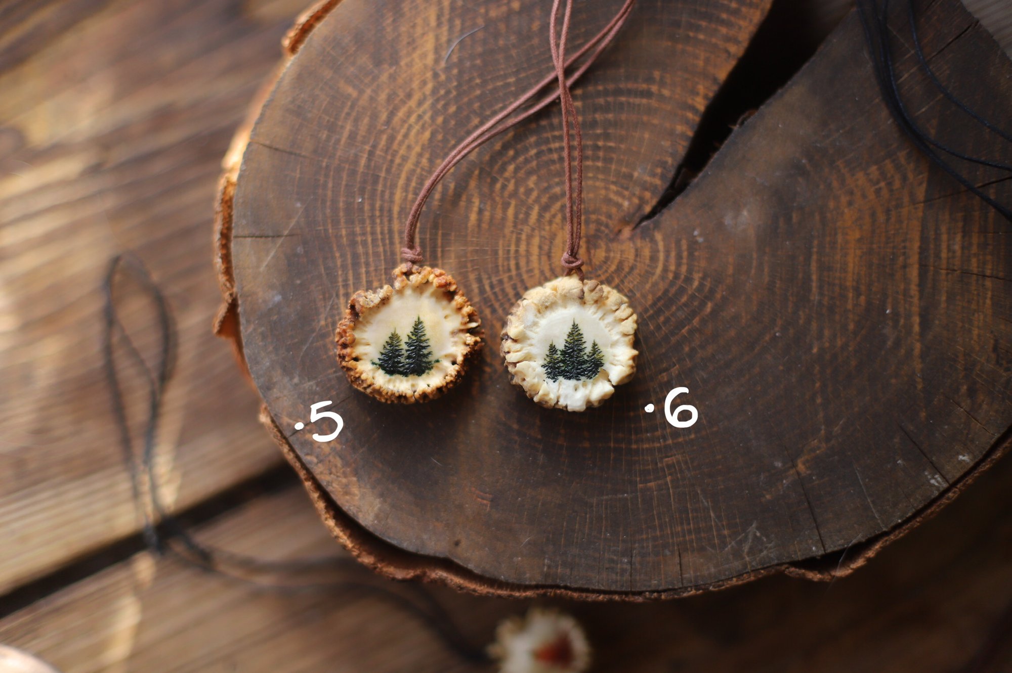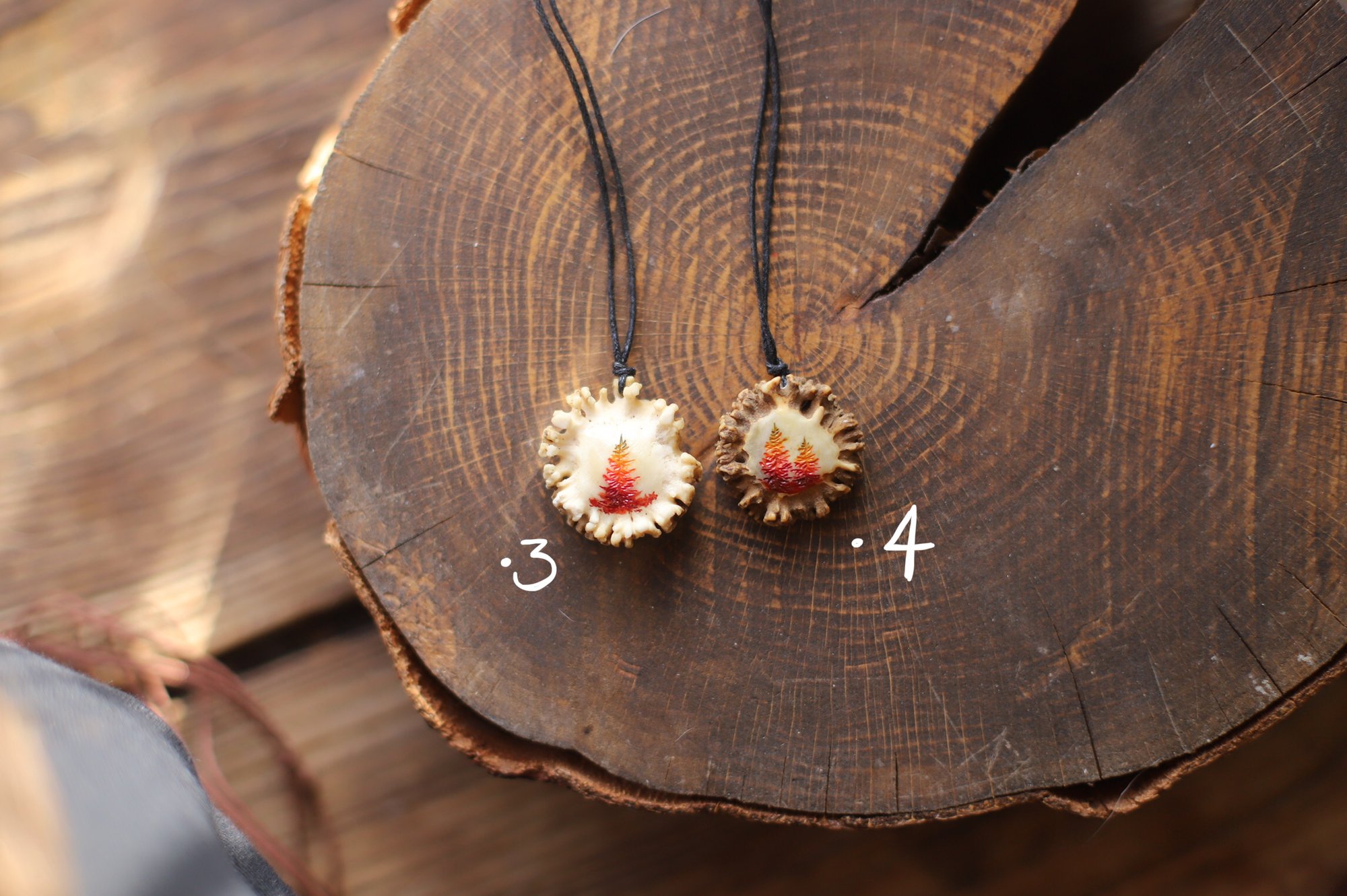 Collana con rosone di capriolo inciso e dipinto con larici verdi e autunnali, o con pietra incastonata