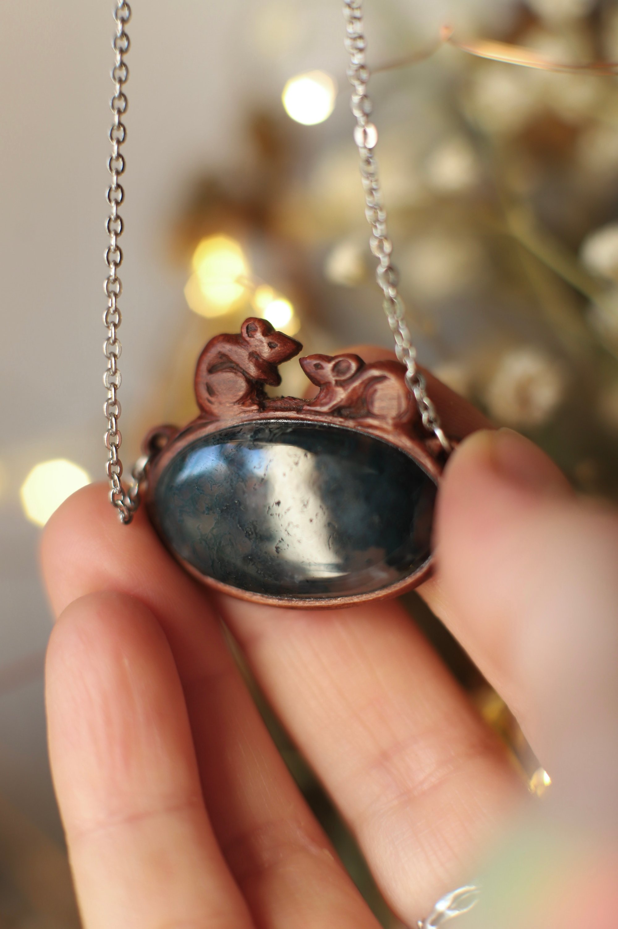 Collana realizzata in legno con due topolini scolpiti e cabochon di agata muschiata.