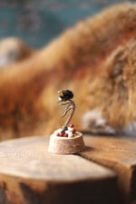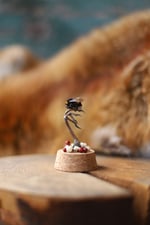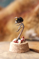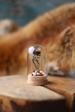 Campana di vetro con all'interno una zampa di merlo essiccata e un vero bombo (Bombus Latreille) -ritrovamenti in natura-