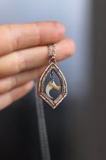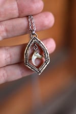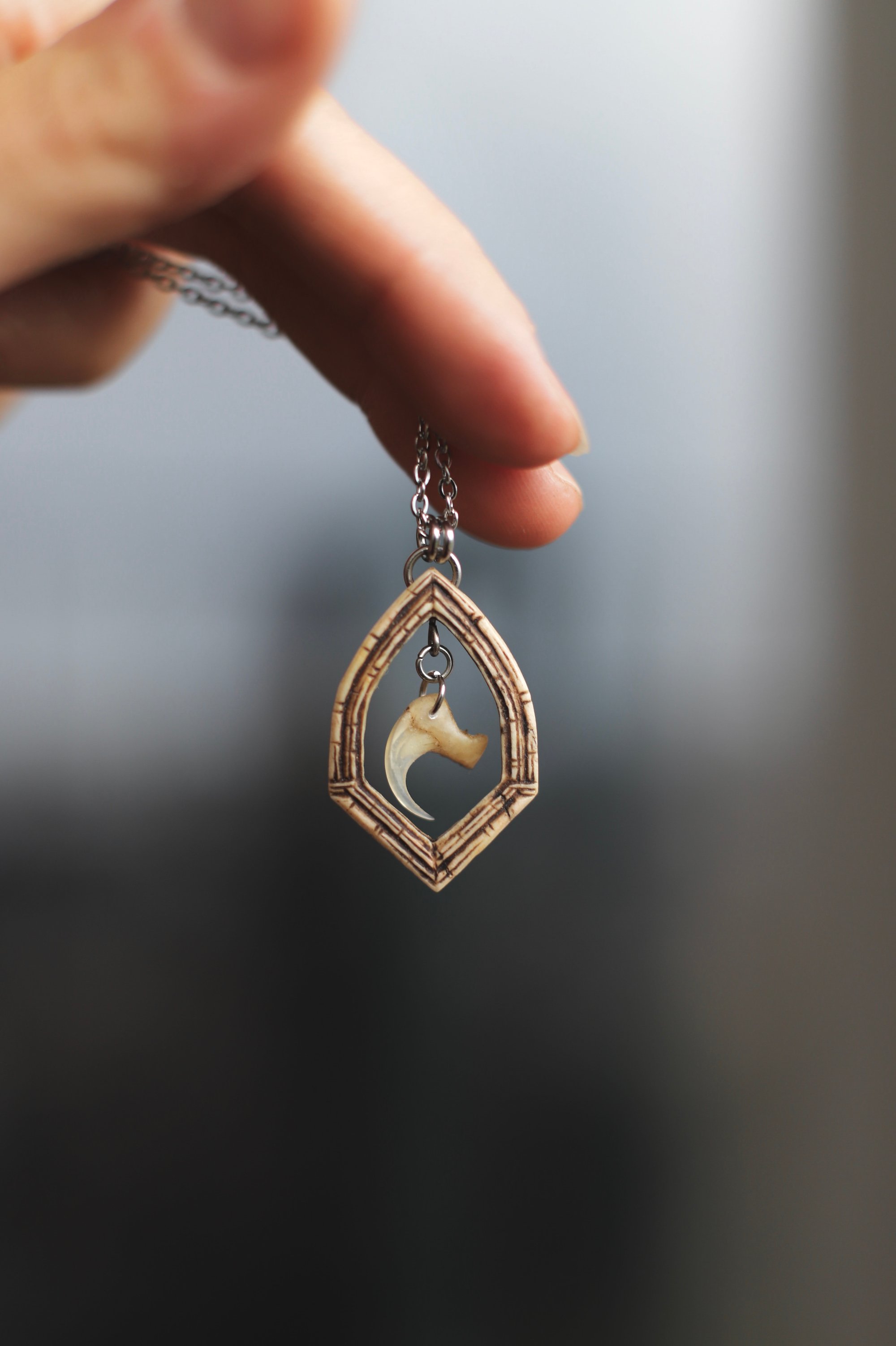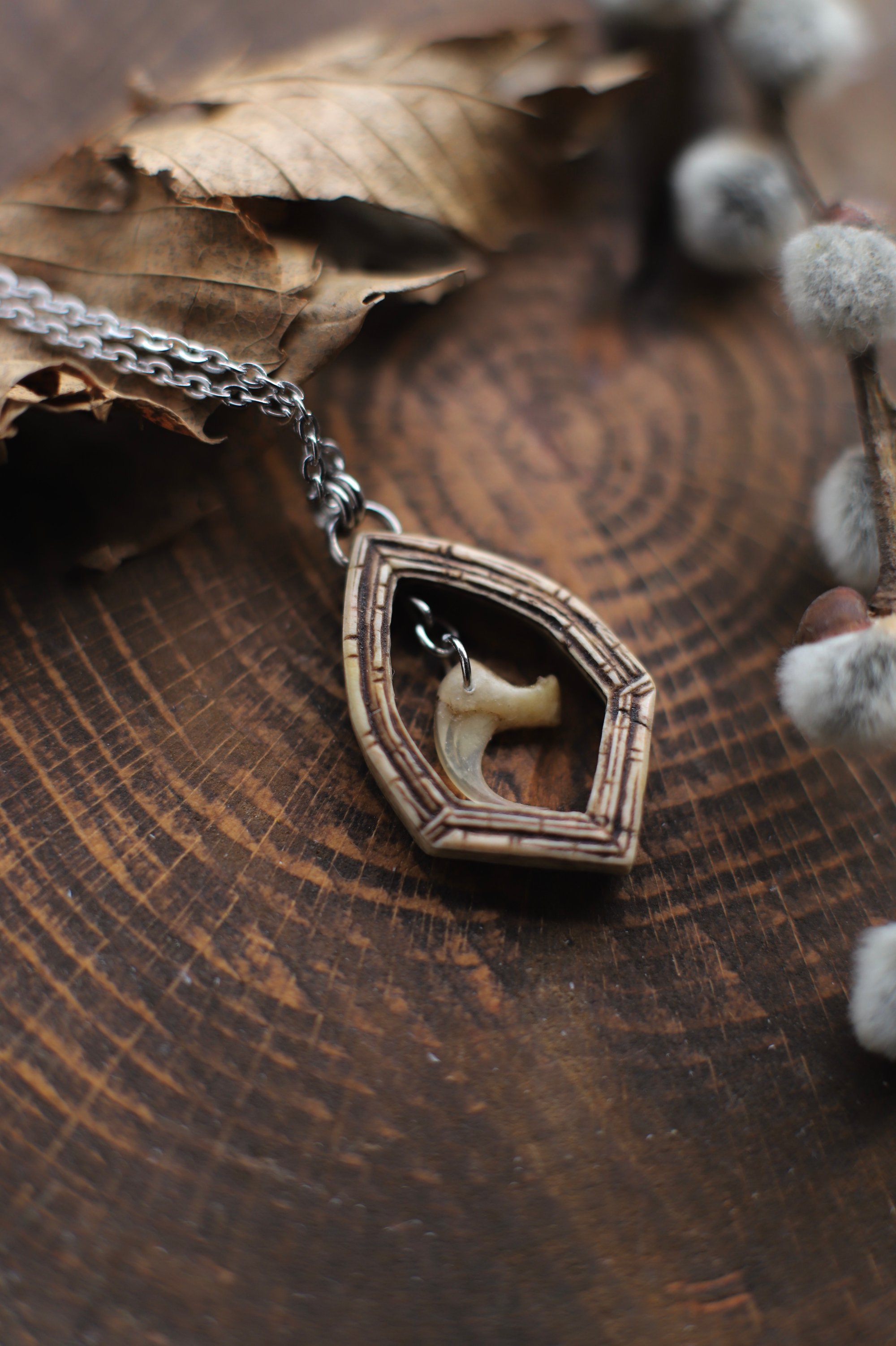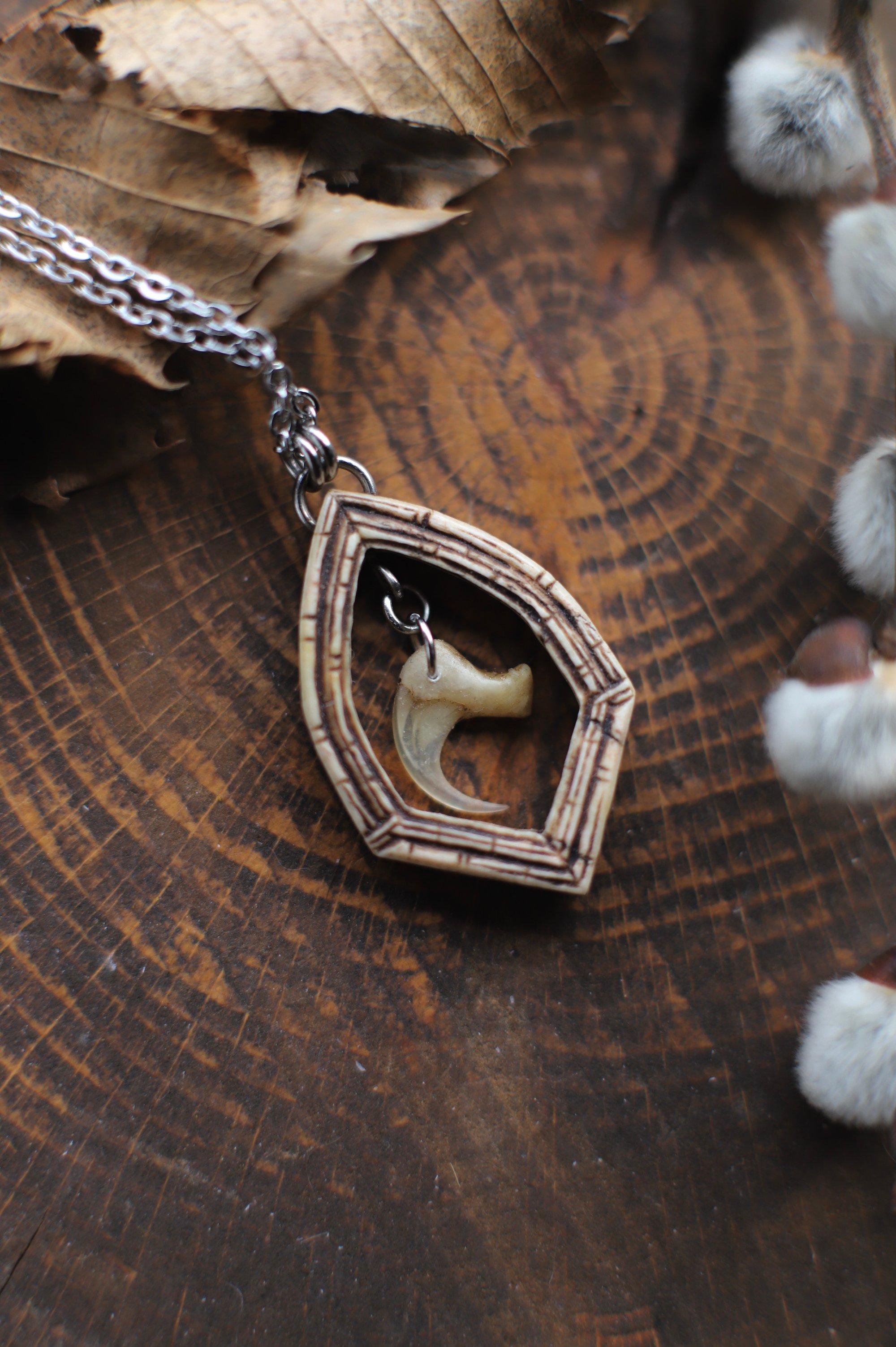 Collana realizzata in corno di cervo, incisa a mano, traforata e con al centro, appeso, un vero artiglio di gatto.