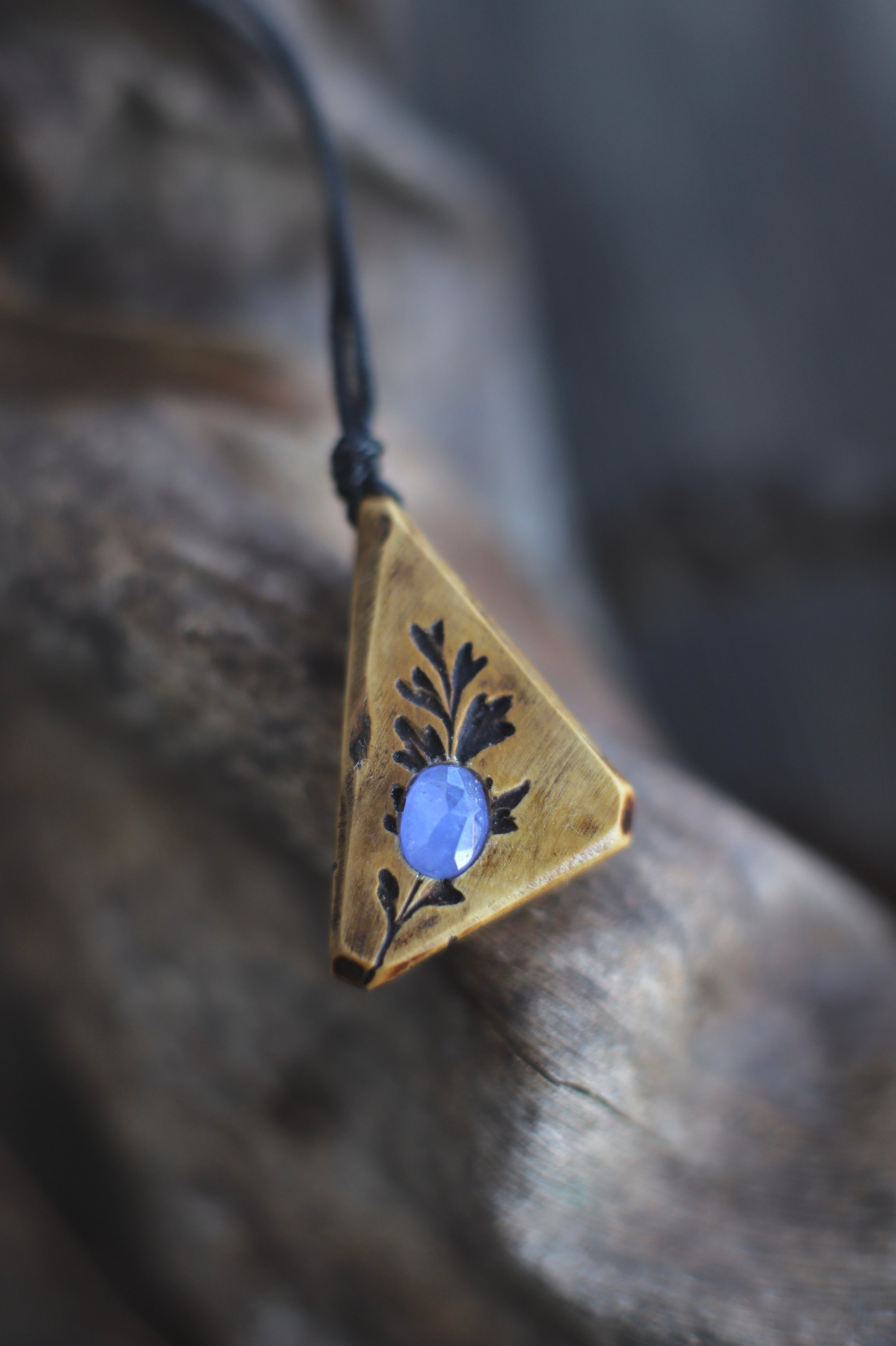 Collana con ciondolo in legno di bosso con riproduzione di pianta fossile (disegno inciso e poi scurito), con pietra taglio rosecut di tanzanite.