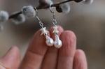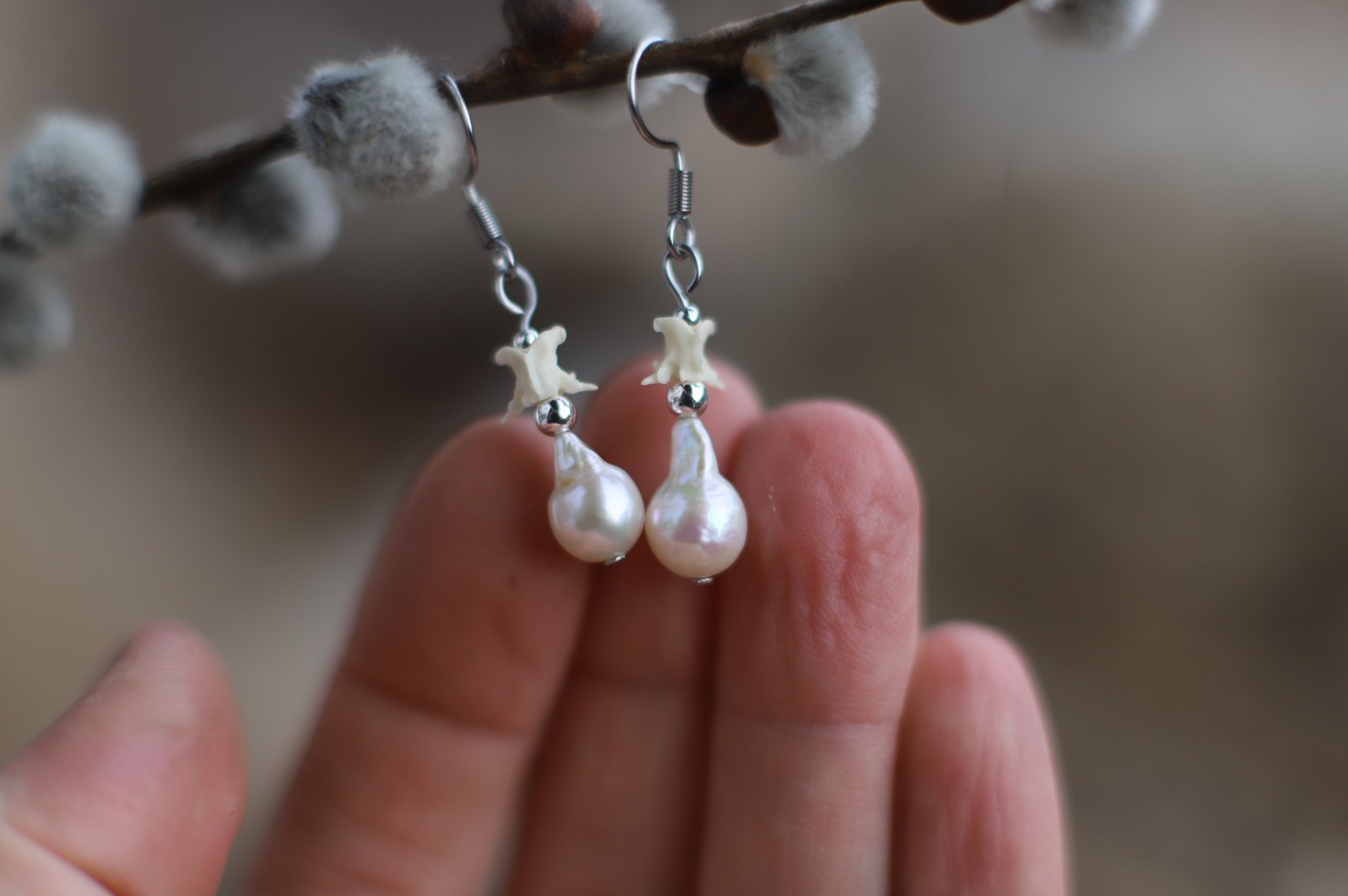 Orecchini realizzati con vertebre di serpente (biacco), sfere in acciaio e perle a goccia (1 cm circa)