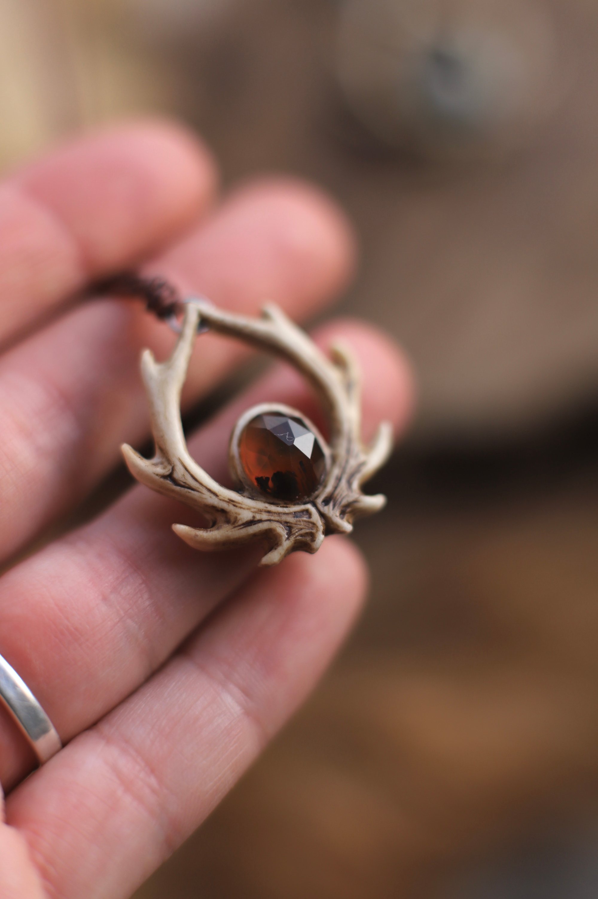 Collane in corno di cervo incise a mano, scurite e decorate con cabochon rosecut di kyanite (pietra blu) e agata del Montana (pietra arancione).