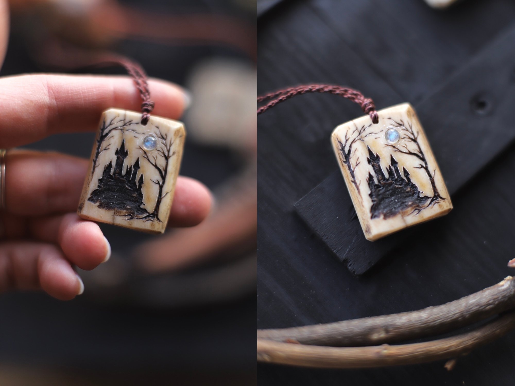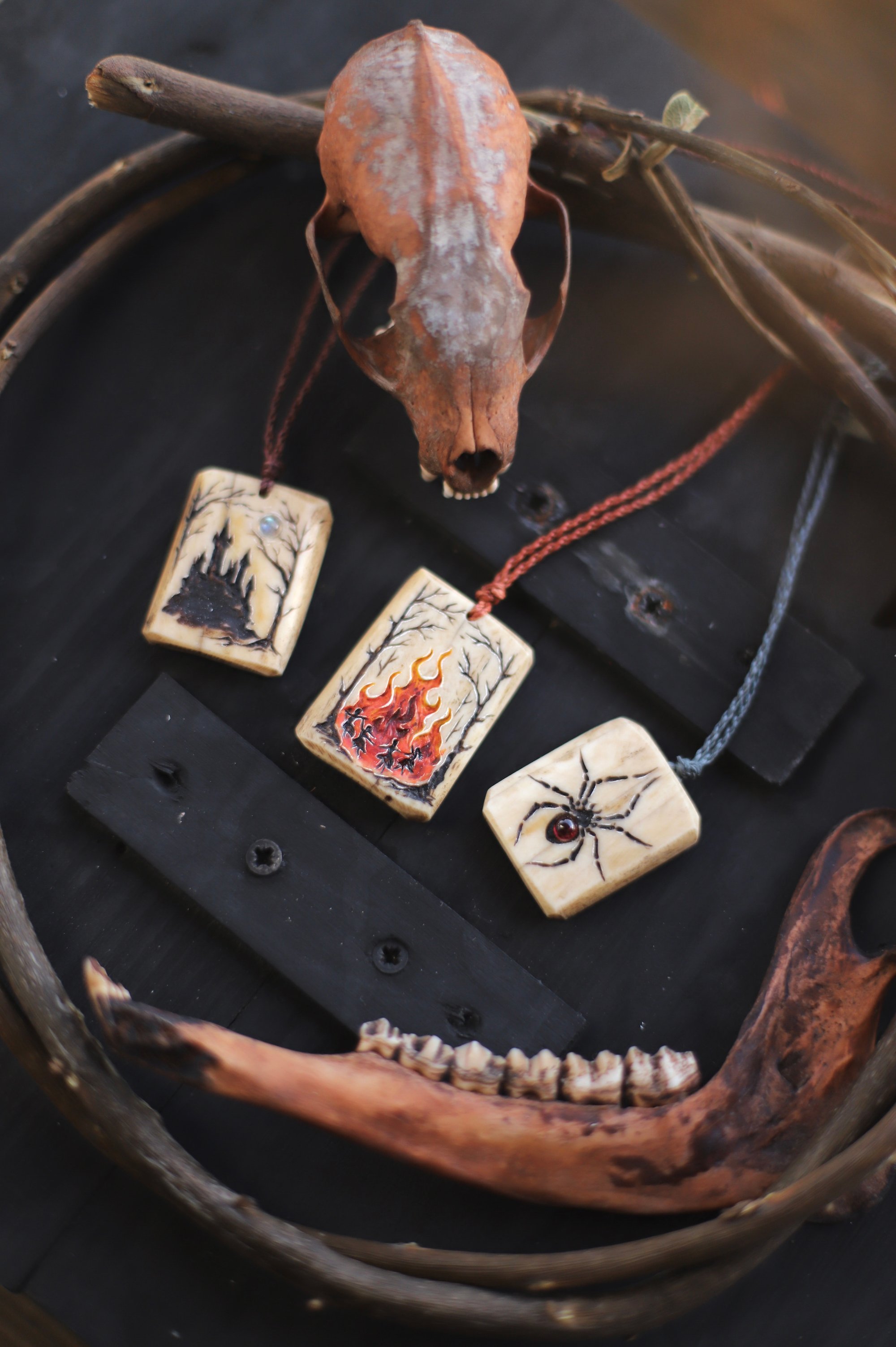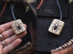 Ciondoli realizzati partendo da ossa di cervo, levigate fino a ricavarne delle placche di forma squadrata e poi incise, scurite con cera anticante, dipinte e decorate con pietre dure.