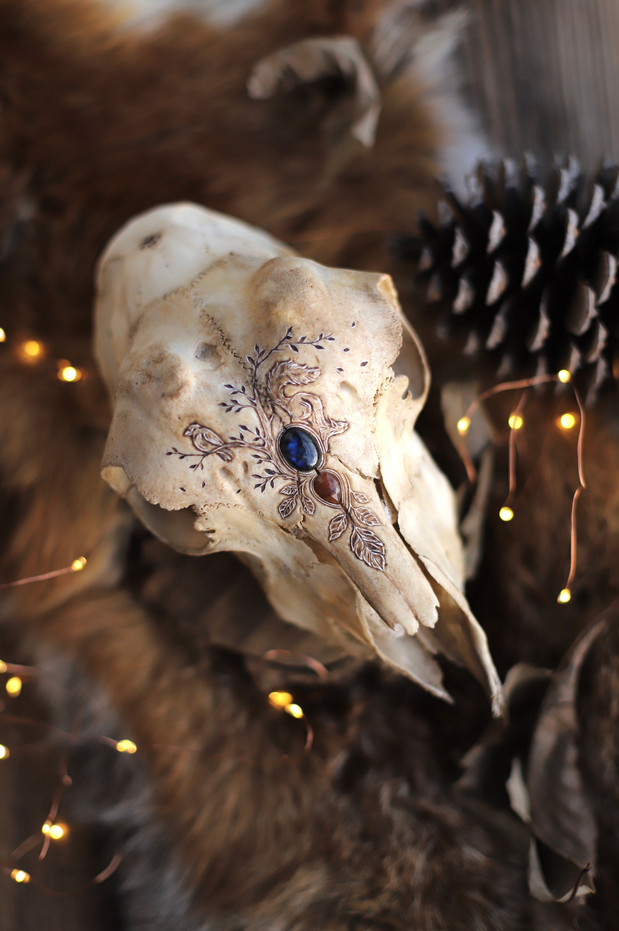 Teschio di capra (recuperato eticamente) con incisioni raffiguranti uno scorcio su un boschetto, con rami, foglie, un passero ed uno scoiattolo. Decorato con cabochon di labradorite blu e agata del Montana.
