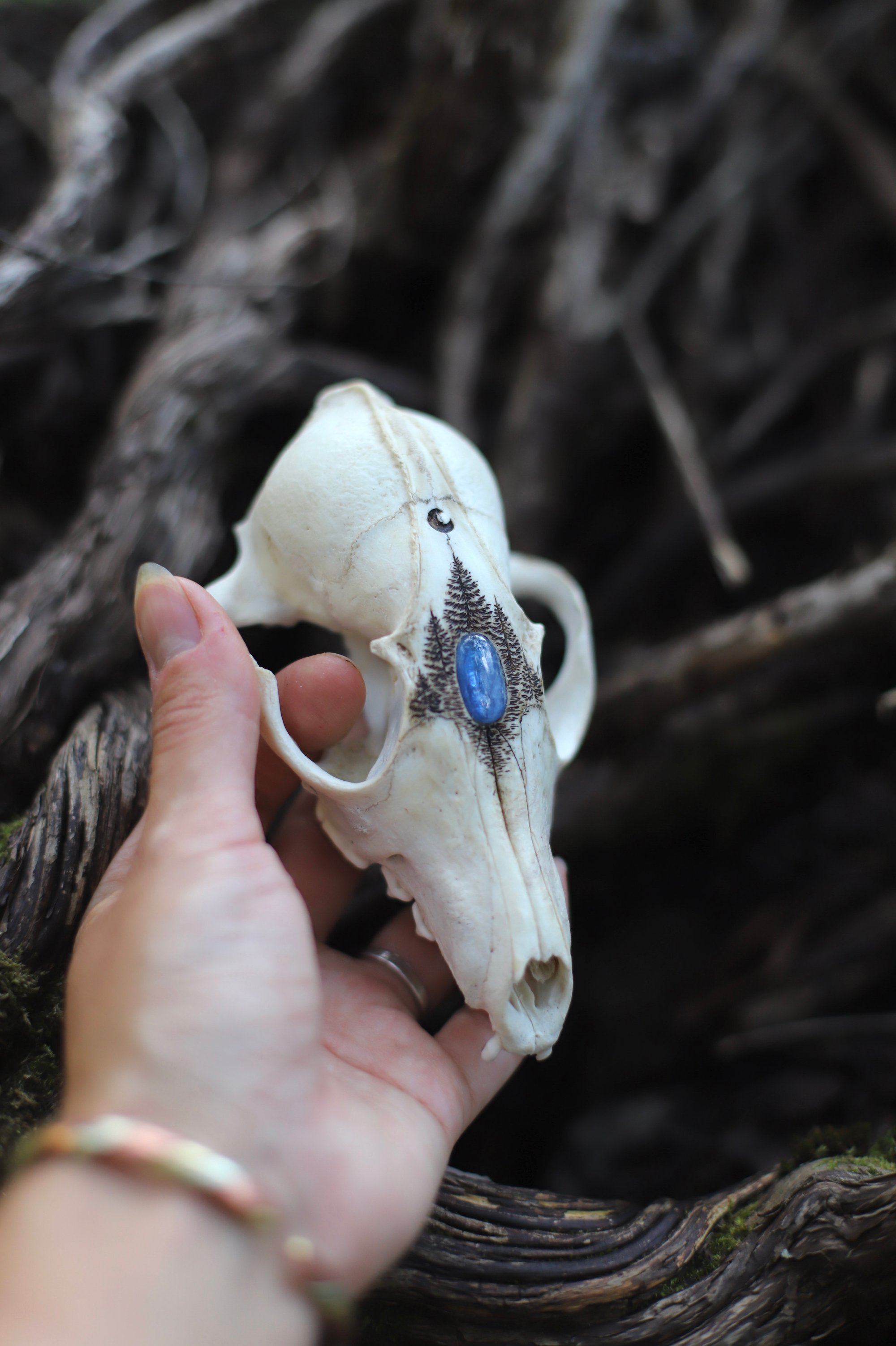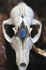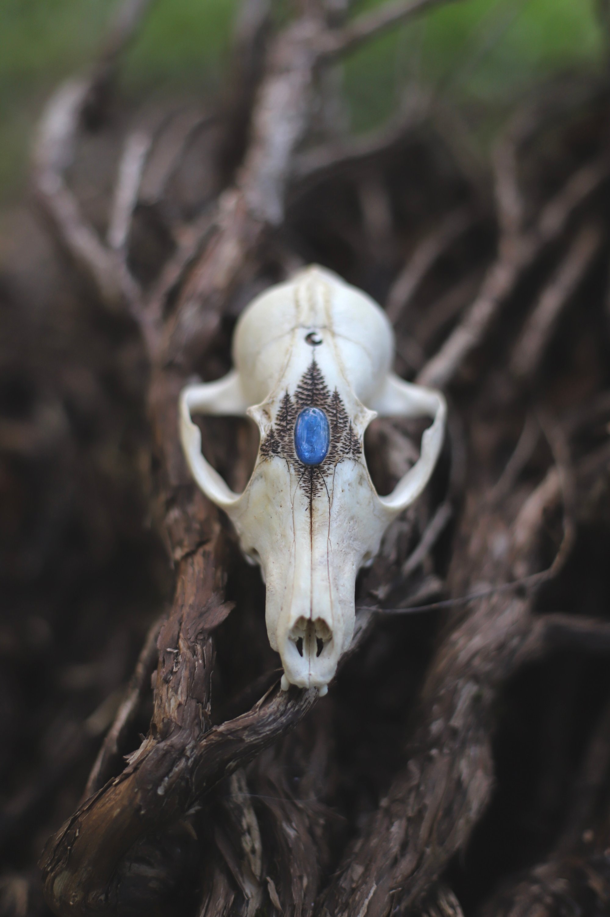 Teschio di volpe inciso con abeti e luna e decorato con cabochon di kyanite.
